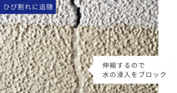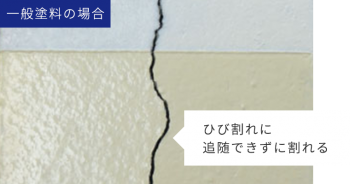 一般塗料では、外壁にヒビが入ると塗膜も一緒に裂け、建物内に水が浸入してしまいますが、