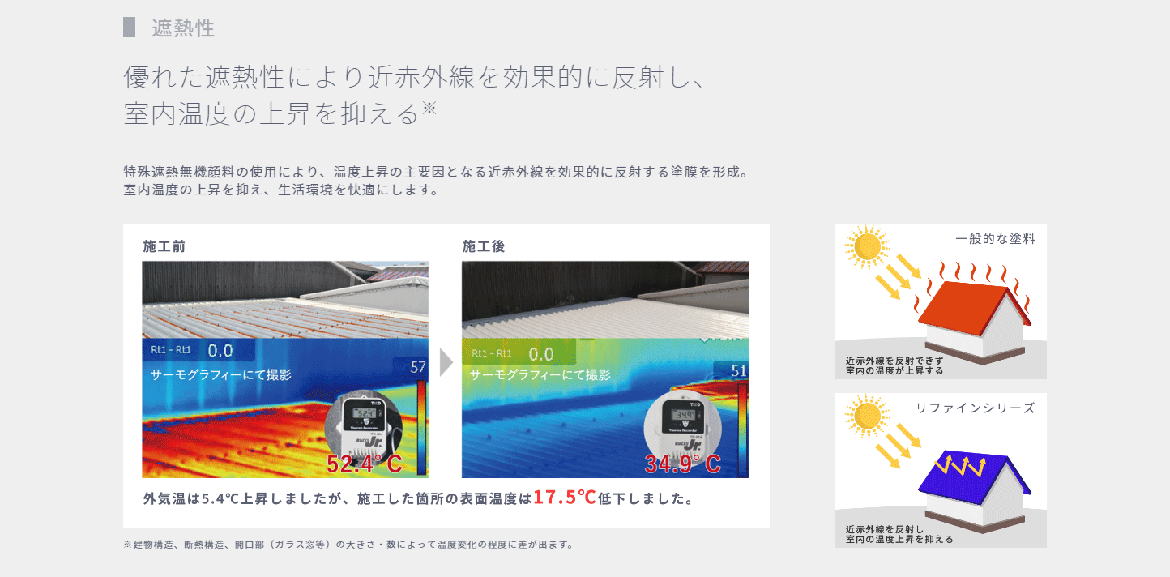 特殊遮熱無機顔料の使用により、温度上昇の主要因となる近赤外線を効果的に反射する塗膜を形成。