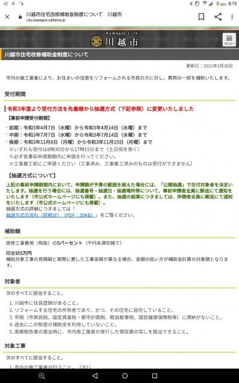 以上、ご報告まで、川越市は7月の中期、11月の後期がありますので、リフォームをお考えの方は、そこに合わせてご検討されても良いのかと思います